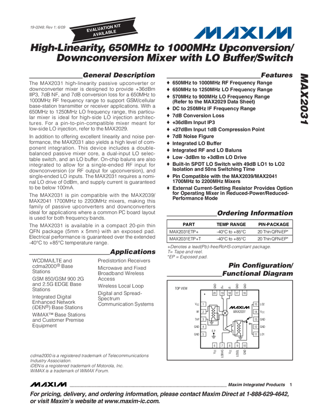 High-Linearity, 650MHz to 1000MHz Upconversion/Downconversion Mixer with LO Buffer/Switch