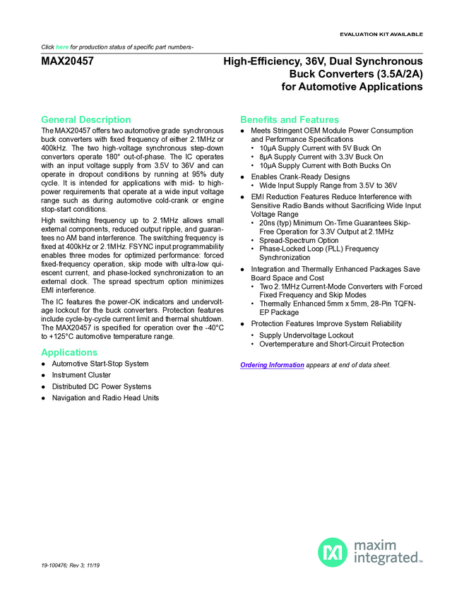 High-Efficiency, 36V, Dual Synchronous Buck Converters (3.5A/2A) for Automotive Applications