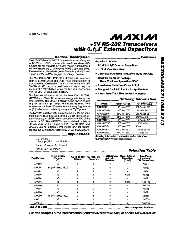MAX200, MAX201, MAX202, MAX203, MAX204, MAX205, MAX206, MAX207, MAX208, MAX209, MAX211, MAX213 +5V, RS-232 Transceivers with 0.1µF External Capacitors