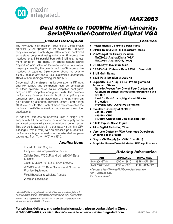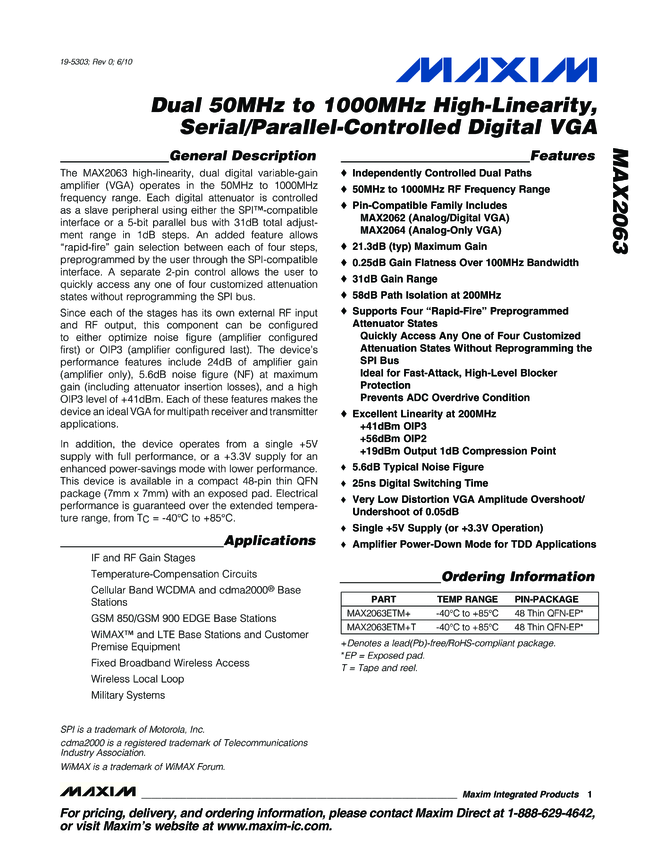 MAX2063 Dual 50MHz to 1000MHz High-Linearity, Serial/Parallel-Controlled Digital VGA