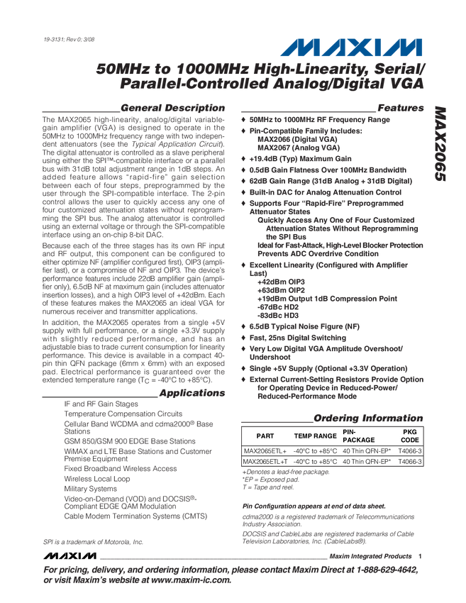 MAX2062 Dual 50MHz to 1000MHz High-Linearity, Serial/Parallel-Controlled Analog/Digital VGA