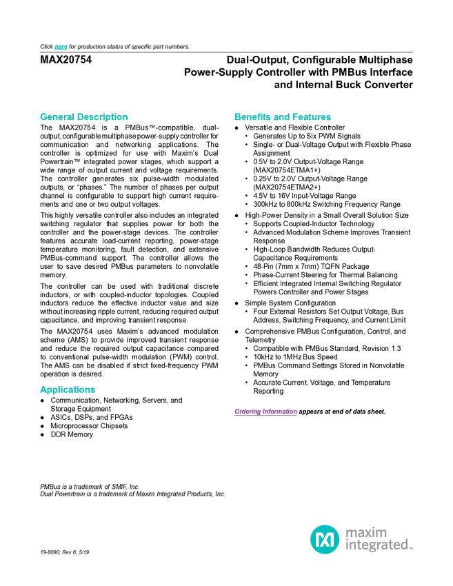 MAX20751 Multiphase Master with PMBus Interface