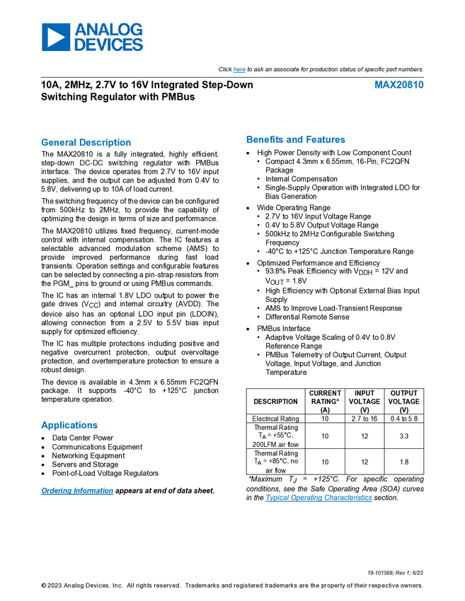 10A, 2MHz, 2.7V to 16V Integrated Step-Down Switching Regulator with PMBus