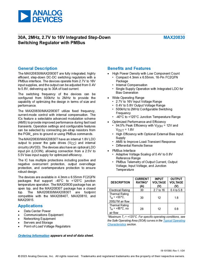 30A, 2MHz, 2.7V to 16V Integrated Step-Down Switching Regulator with PMBus