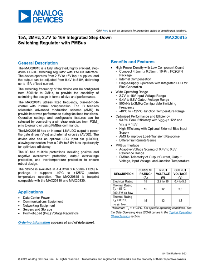 15A, 2MHz, 2.7V to 16V Integrated Step-Down Switching Regulator with PMBus