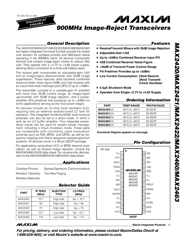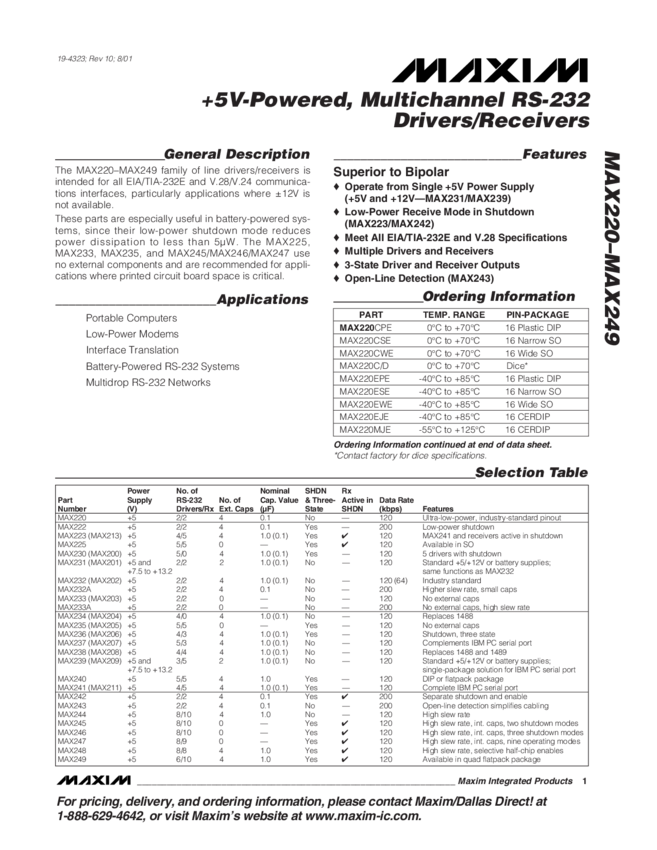 MAX220, MAX222, MAX223, MAX225, MAX230, MAX231, MAX232, MAX232A, MAX233, MAX233A, MAX234, MAX235, MAX236, MAX237, MAX238, MAX239, MAX240, MAX241, MAX242, MAX243, MAX244, MAX245, MAX246, MAX247, MAX248, MAX249 +5V-Powered, Multichannel RS-232 Drivers/Recei