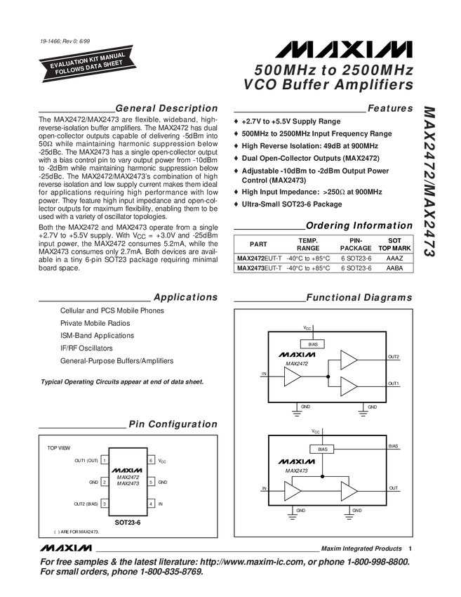 500MHz to 2500MHz, VCO Buffer Amplifiers