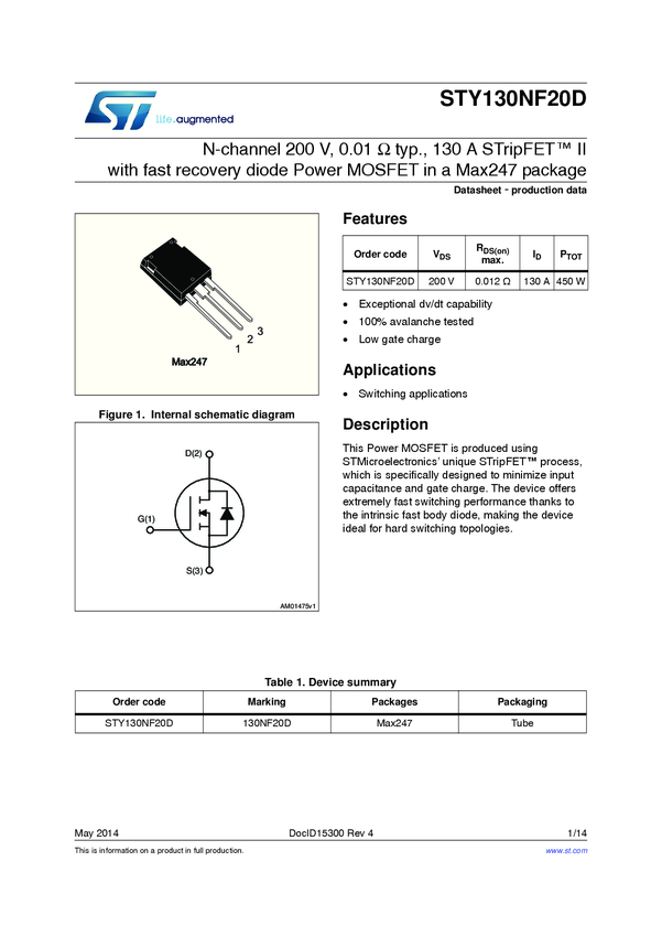 N-channel 200 V, 0.01 Ohm typ., 130 A, STripFET(TM) II with fast recovery diode Power MOSFET in Max247 package