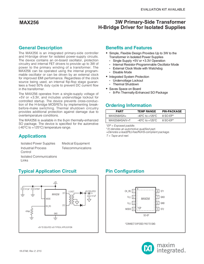 MAX256 3W Primary-Side Transformer H-Bridge Driver for Isolated Supplies