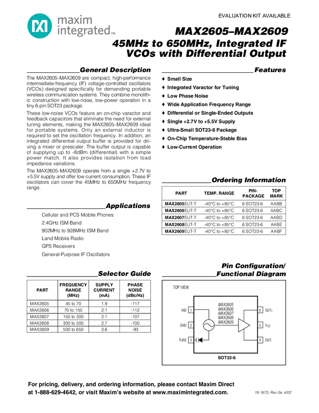 MAX2605, MAX2606, MAX2607, MAX2608, MAX2609 45MHz to 650MHz, Integrated IF VCOs with Differential Output