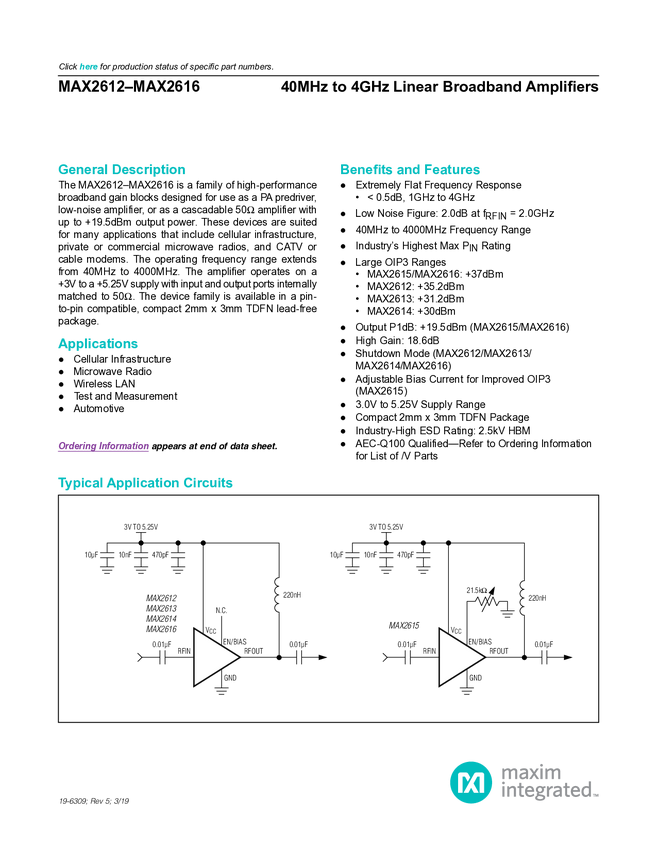 MAX2612, MAX2613, MAX2614, MAX2615, MAX2616 40MHz to 4GHz Linear Broadband Amplifiers