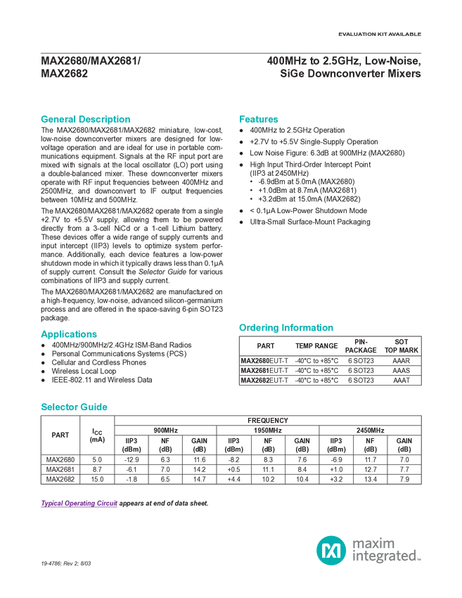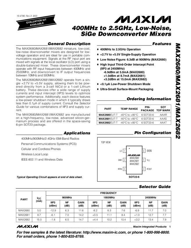 MAX2682 SiGe Downconverter Mixer with Shutdown