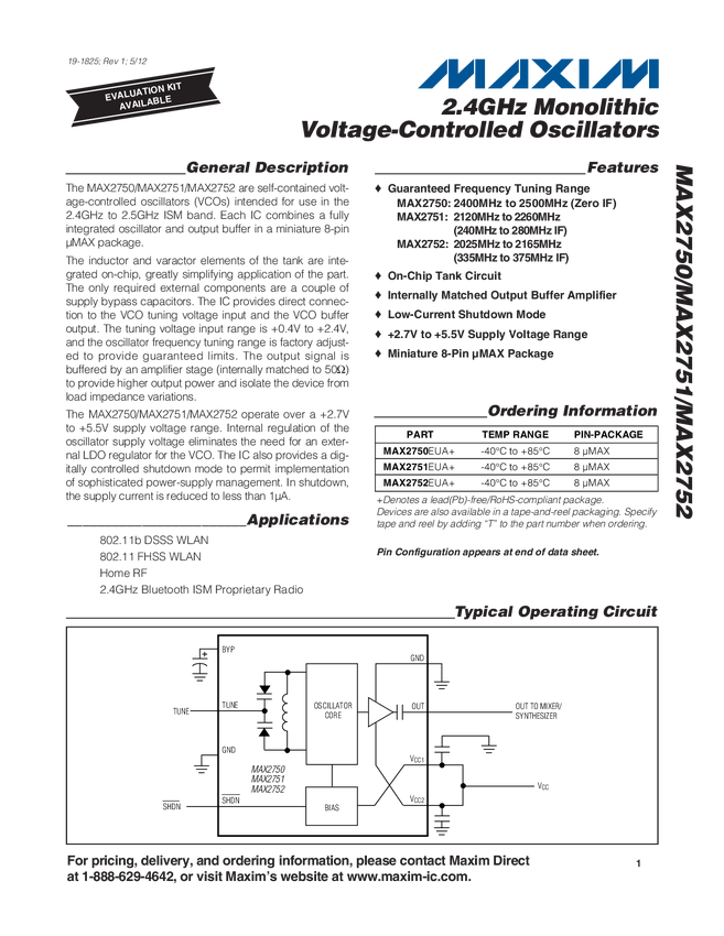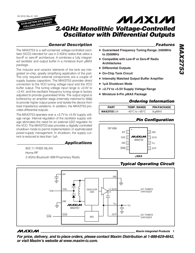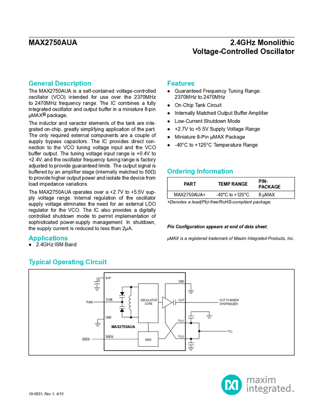 2.4GHz, Monolithic Voltage-Controlled Oscillator with Differential Outputs