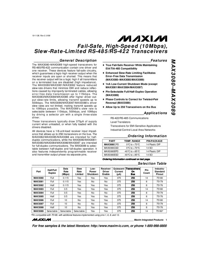MAX3080, MAX3081, MAX3082, MAX3083, MAX3084, MAX3085, MAX3086, MAX3087, MAX3088, MAX3089 Fail-Safe, High-Speed (10Mbps), Slew-Rate-Limited RS-485/RS-422 Transceivers