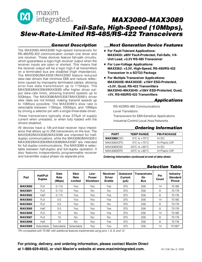 MAX3080, MAX3081, MAX3082, MAX3083, MAX3084, MAX3085, MAX3086, MAX3087, MAX3088, MAX3089 Fail-Safe, High-Speed (10Mbps), Slew-Rate-Limited RS-485/RS-422 Transceivers
