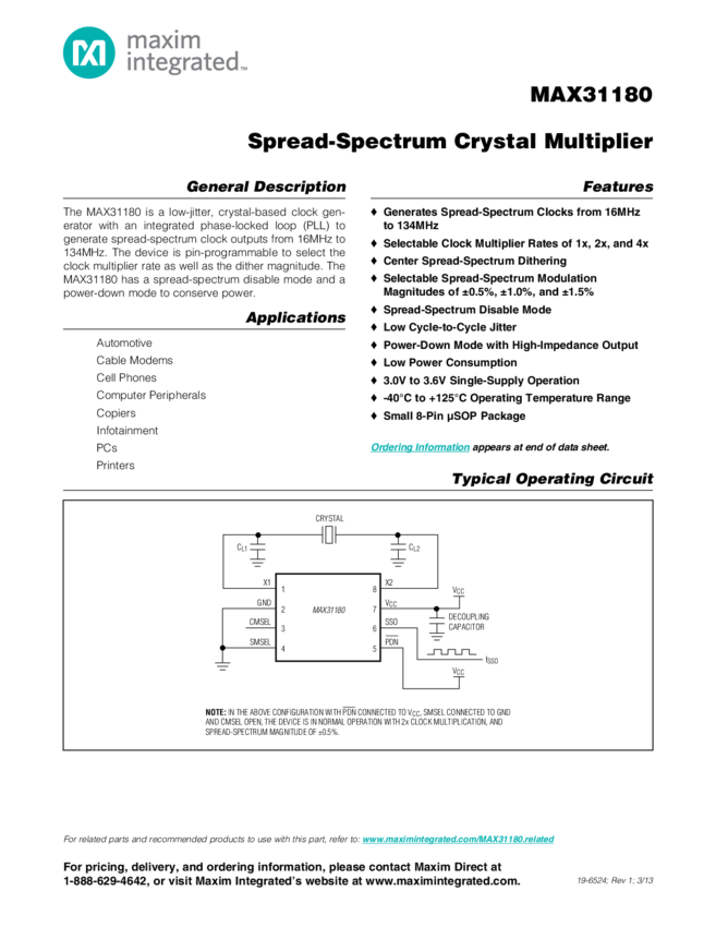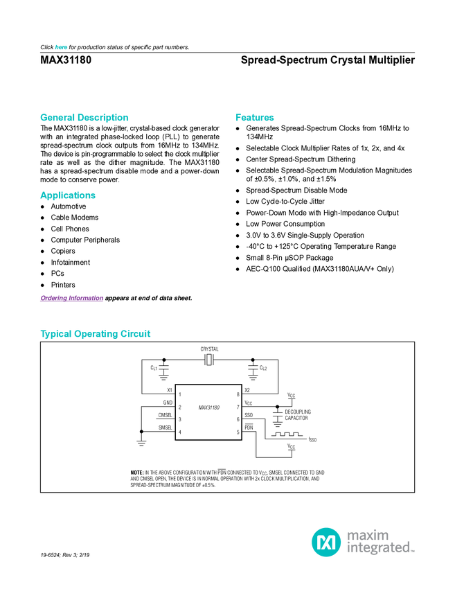MAX31180 Spread-Spectrum Crystal Multiplier