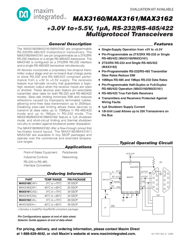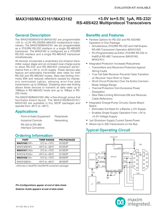 MAX3160, MAX3161, MAX3162 +3.0V to +5.5V, 1µA, RS-232/RS-485/422 Multiprotocol Transceivers