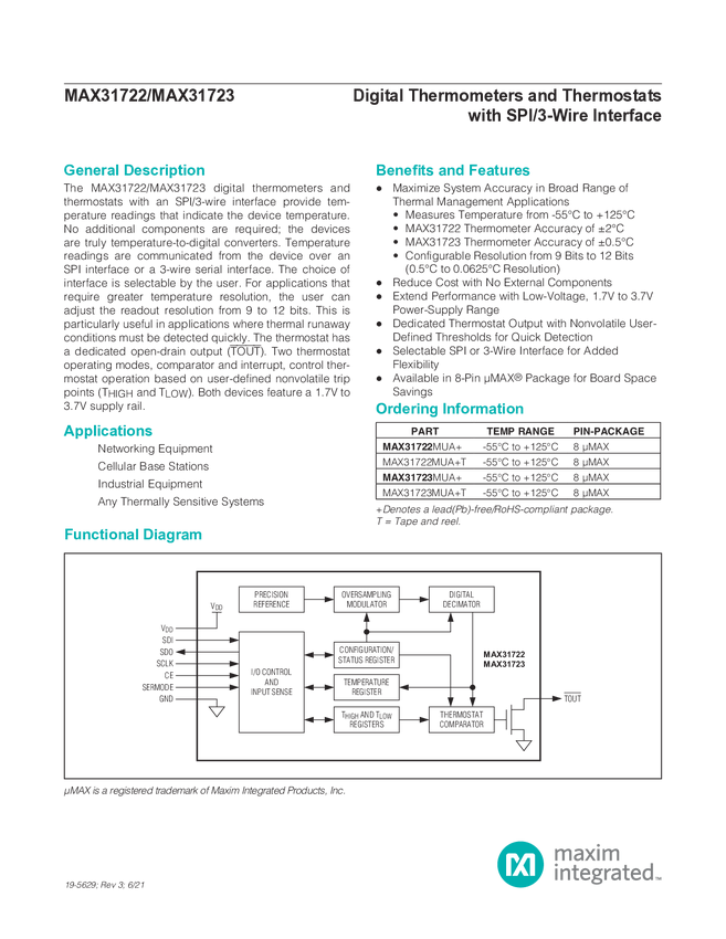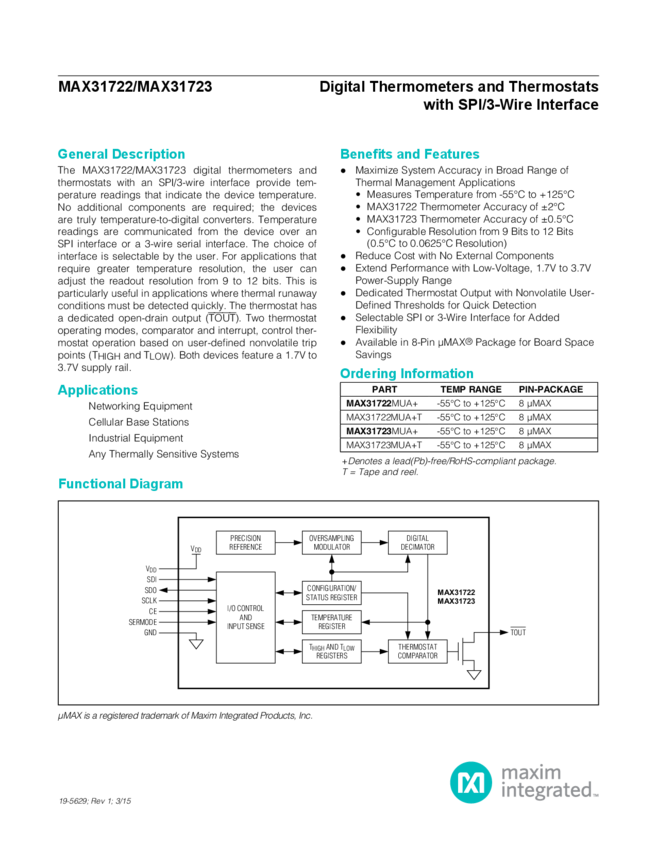 MAX31722, MAX31723 Digital Thermometers and Thermostats with SPI/3-Wire Interface