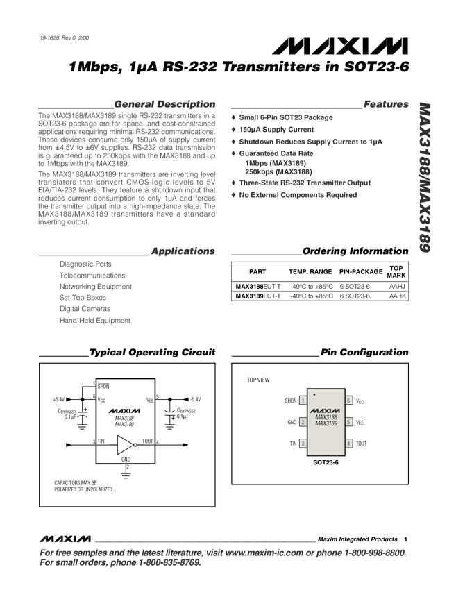 1Mbps, 1µA RS-232 Transmitters in SOT23-6