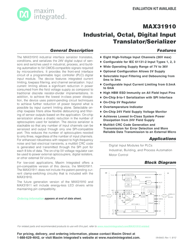 MAX31910 Industrial, Octal, Digital Input Translator/Serializer