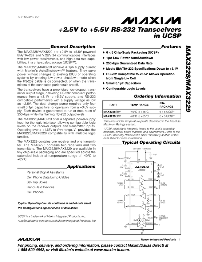 MAX3228, MAX3229 +2.5V to +5.5V RS-232 Tranceivers in UCSP