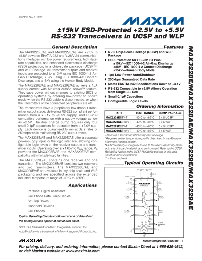 MAX3228AE, MAX3228E, MAX3229AE, MAX3229E ±15kV ESD-Protected +2.5V to +5.5V RS-232 Transceivers in UCSP and WLP