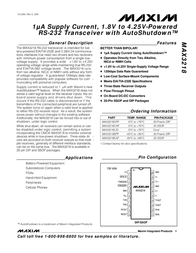 MAX3218 1µA, 1.8V to 4.25V RS-232 Transceiver with AutoShutdown™