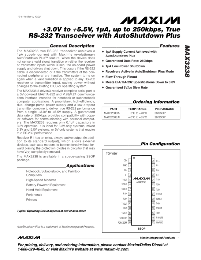 MAX3224, MAX3225, MAX3226, MAX3227, MAX3244, MAX3245 1µA Supply Current, 1Mbps, 3.0V to 5.5V, RS-232 Transceivers with AutoShutdown Plus
