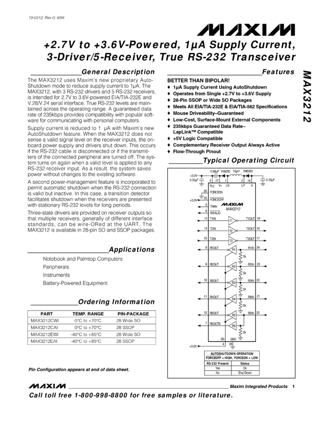 MAX3212 +2.7V to +3.6V Powered, 1µA Supply Current, 3-Driver/5-Receiver, True RS-232 Transceiver