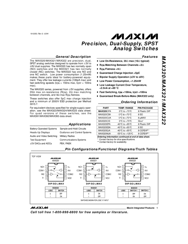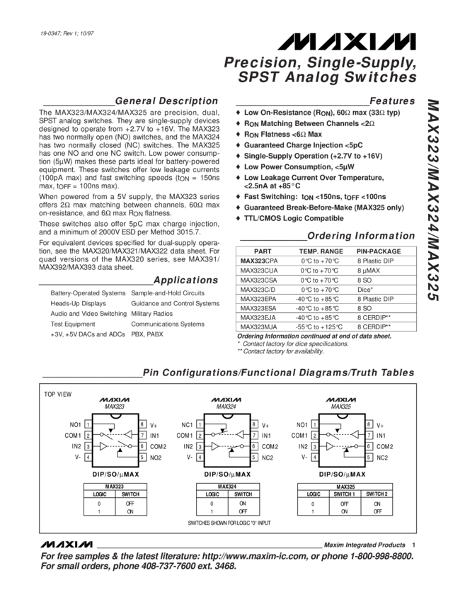 MAX323, MAX324, MAX325 Precision, Single-Supply, SPST Analog Switches