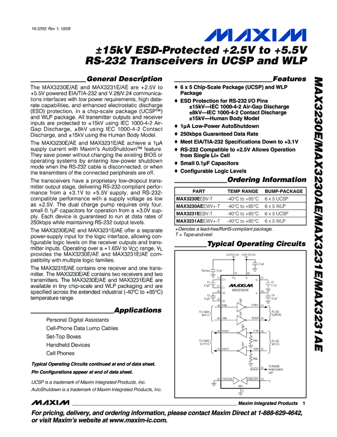 MAX3230AE, MAX3230E, MAX3231AE, MAX3231E ±15kV ESD-Protected +2.5V to +5.5V RS-232 Transceivers in UCSP and WLP