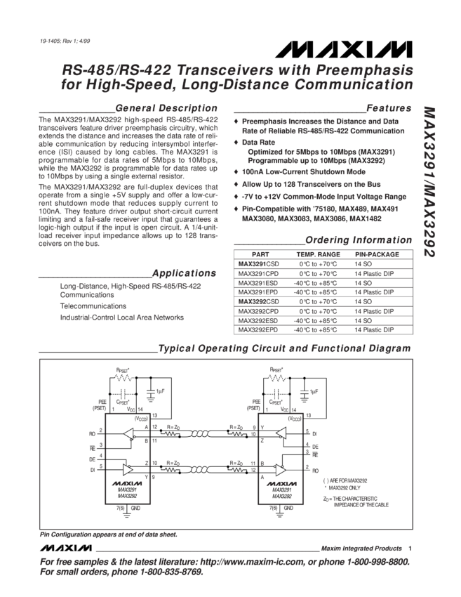 MAX3291, MAX3292 RS-485/RS-422 Transceivers with Preemphasis for High-Speed, Long-Distance Communication