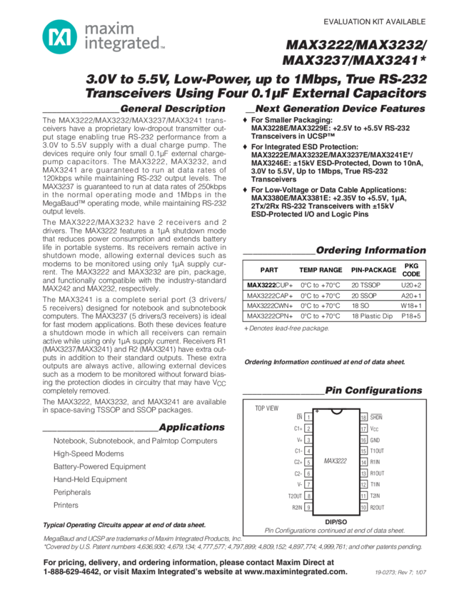 MAX3222, MAX3232, MAX3237, MAX3241 3.0V to 5.5V, Low-Power, up to 1Mbps, True RS-232 Transceivers Using Four 0.1µF External Capacitors