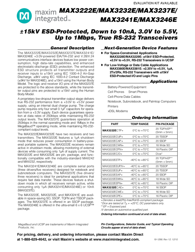 MAX3222E, MAX3232E, MAX3237E, MAX3241E, MAX3246E ±15kV ESD-Protected, Down to 10nA, 3.0V to 5.5V, Up to 1Mbps, True RS-232 Transceivers