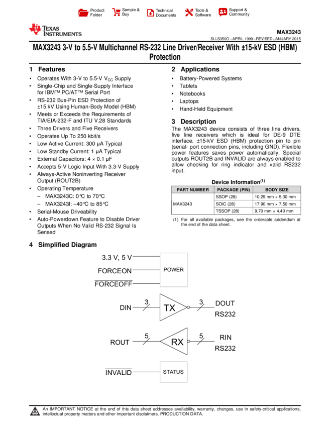 MAX3221E, MAX3223E, MAX3243E ±15kV ESD-Protected, 1µA, 3.0V to 5.5V, 250kbps, RS-232 Transceivers with AutoShutdown