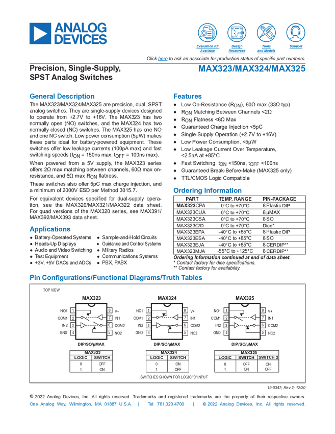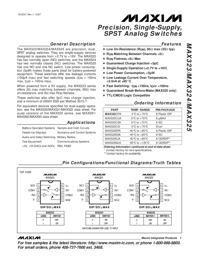 MAX325 Precision, Single-Supply, SPST CMOS Analog Switch (1NO, 1 NC)
