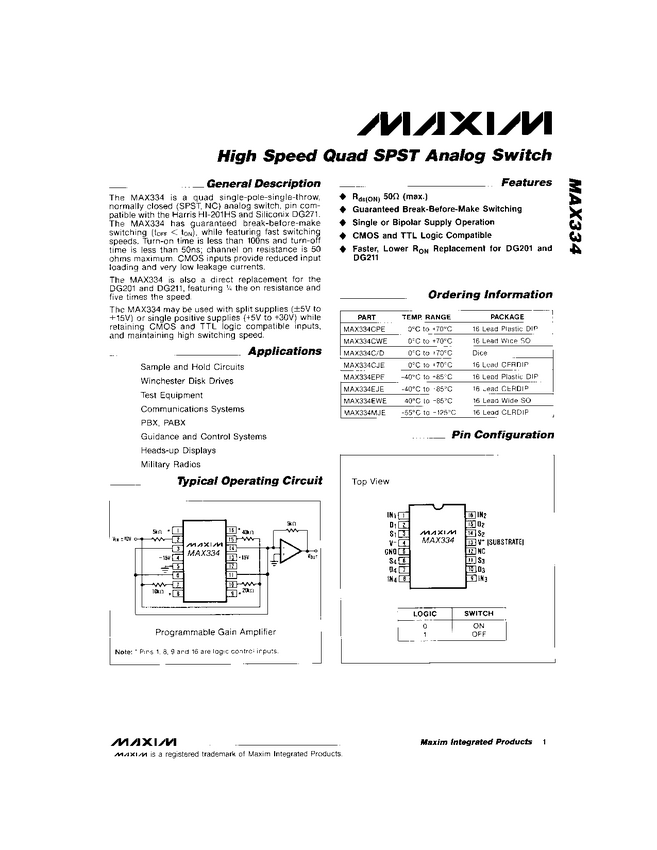 Quad, SPST, High-Speed, Break-Before-Make Analog Switch