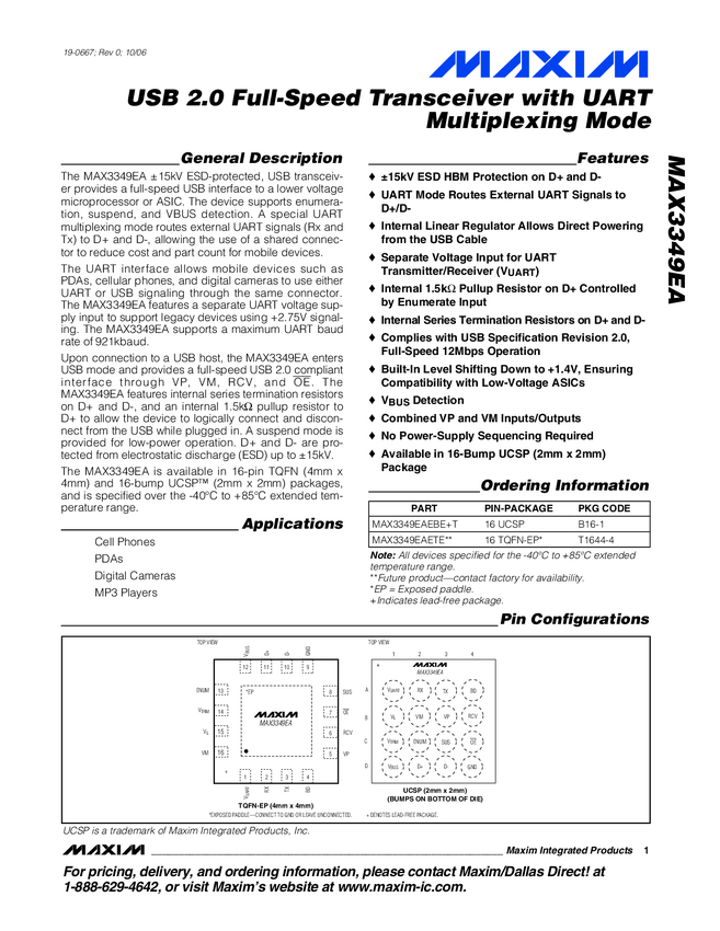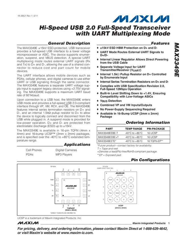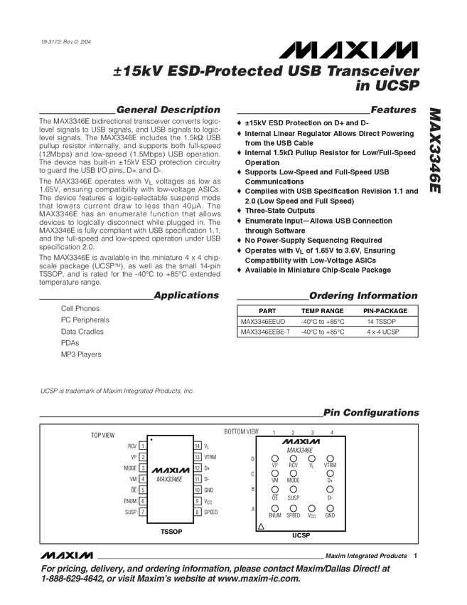 ±15kV ESD-Protected USB Transceivers in UCSP with USB Detect