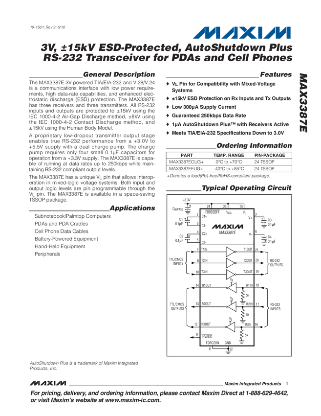 3V, ±15kV ESD-Protected, AutoShutdown Plus RS-232 Transceiver for PDAs and Cell Phones