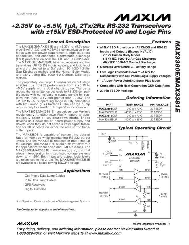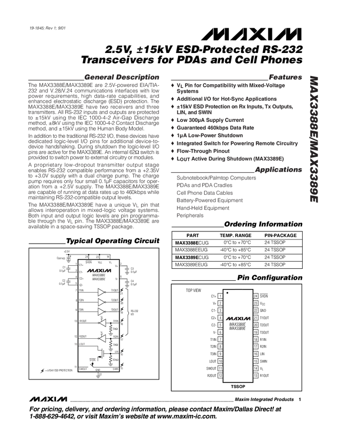 2.5V, ±15kV ESD-Protected RS-232 Transceivers for PDAs and Cell Phones