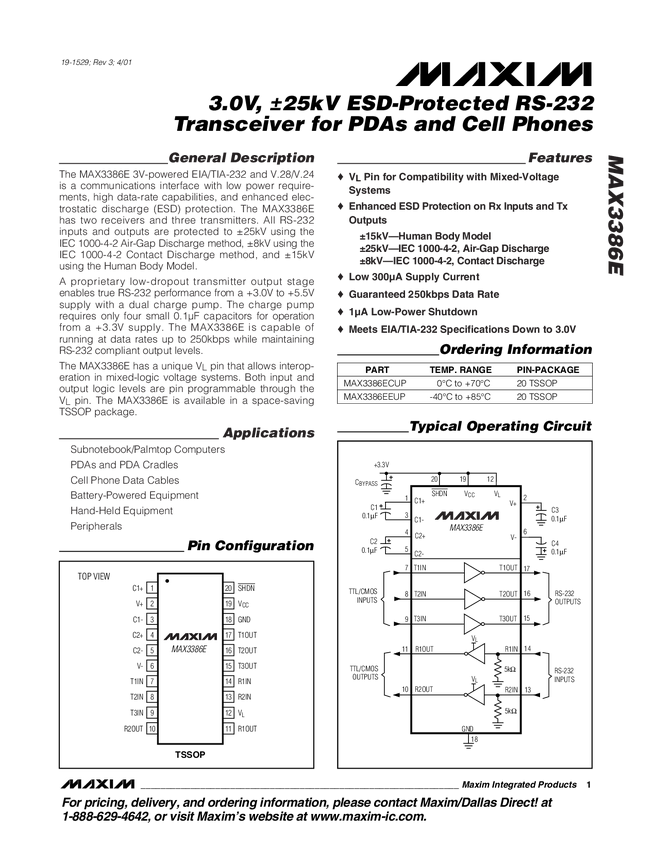 3.0V, ±15kV ESD-Protected RS-232 Transceivers for PDAs and Cell Phones
