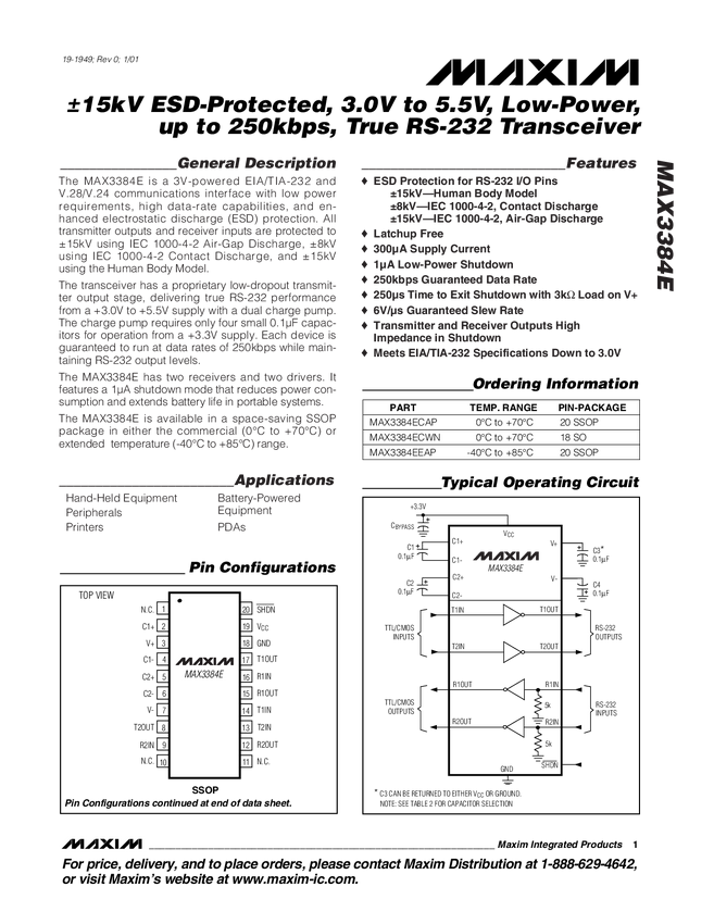 ±15kV ESD-Protected, 3.0V to 5.5V, Low-Power, Up to 250kbps, True RS-232 Transceiver