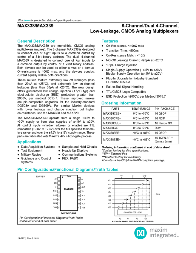 MAX338, MAX339 8-Channel/Dual 4-Channel, Low-Leakage, CMOS Analog Multiplexers
