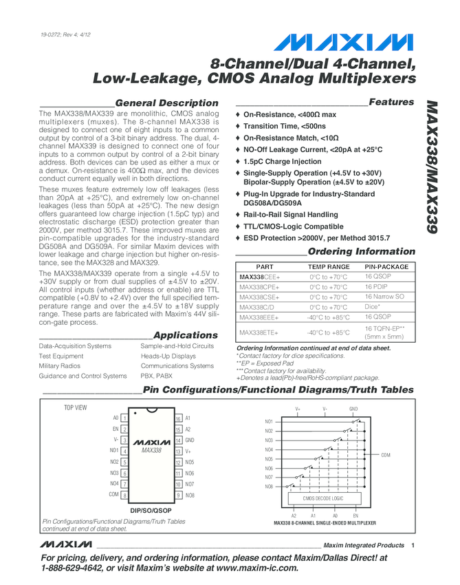 MAX339 Dual 4-Channel, Low-Leakage, CMOS Analog Multiplexer