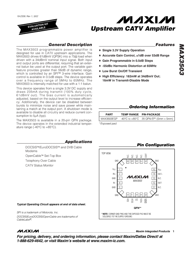 MAX3503 Upstream CATV Amplifier