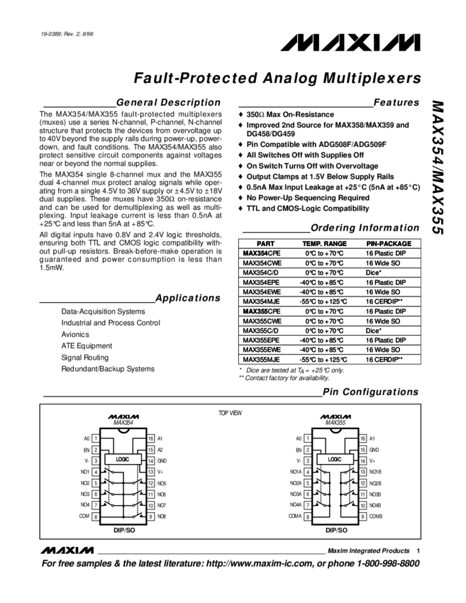 MAX359 Differential 4-Channel, Fault-Protected Multiplexer