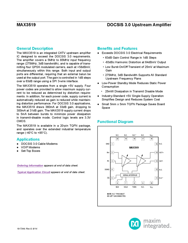 MAX3519 DOCSIS 3.0 Upstream Amplifier