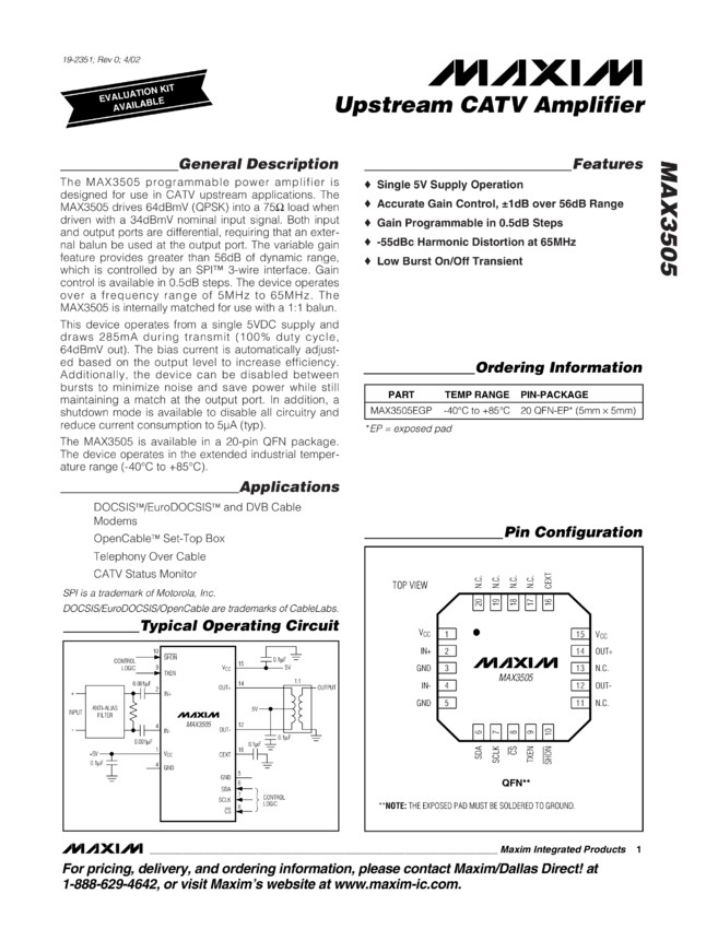 MAX3505 Upstream CATV Amplifier