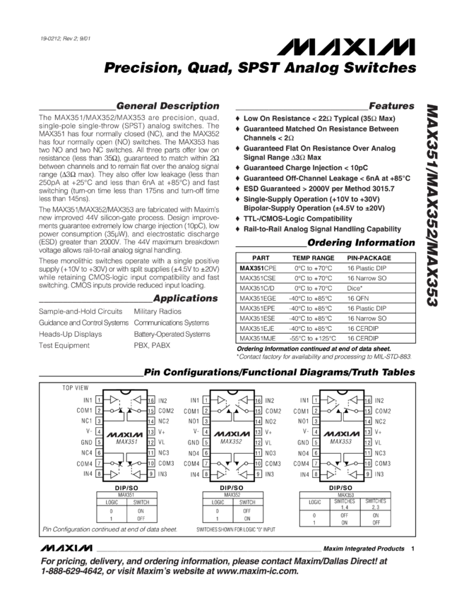 MAX351, MAX352, MAX353 Precision, Quad, SPST Analog Switches