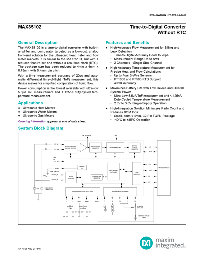 MAX35102 Reduced Power Time-to-Digital Converter